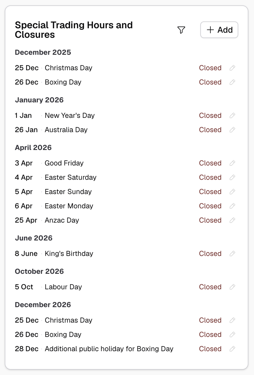 Exceptions allow you to override your weekly trading hours for specific dates. Use them to handle public holidays, special events, staff training days, or one-off closures.