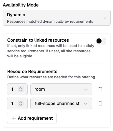 Toggle Constrain to linked resources to limit matching to only those resources explicitly linked to the offering. Use this when you want dynamic matching within a specific pool of resources rather than your entire site.