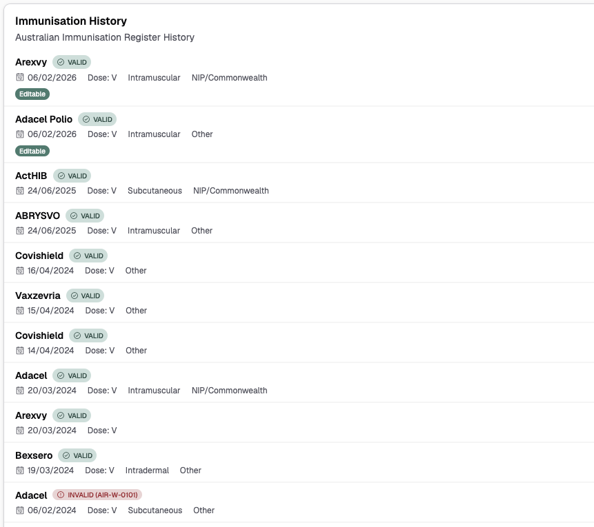 The immunisation history card displays all vaccination records for a patient from AIR, sorted by most recent first.