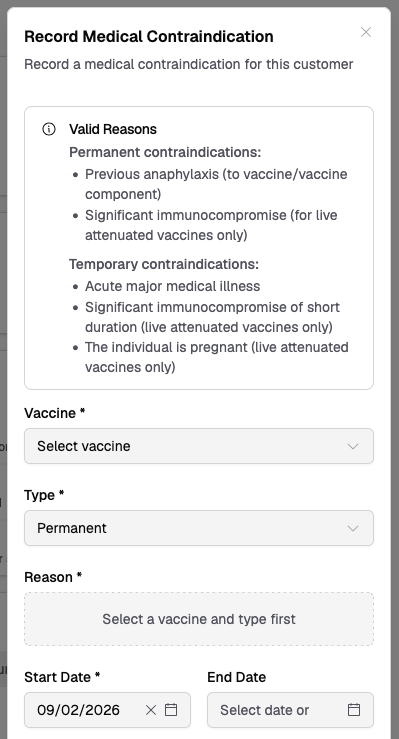 - Vaccine (required) — select the contraindicated vaccine from the dropdown