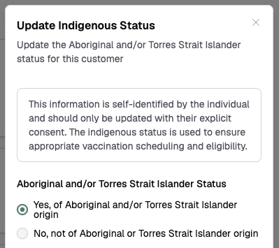 Updating indigenous status may change the patient's due vaccine list and vaccine eligibility. Review due vaccines after updating.